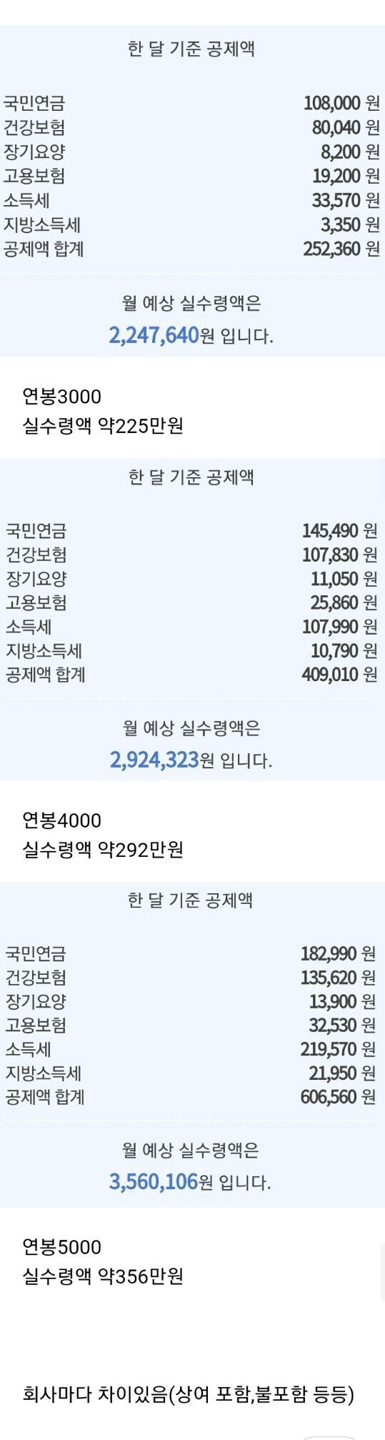 자, 여러분들 어떠신가요? 연봉 3000이 보기에 4000이 커보이고 또 5000이 커보이겠지만 실수령액을 월급으로 계산해 보면 사는데 그리 충분한 금액은 아니지 않습니까?