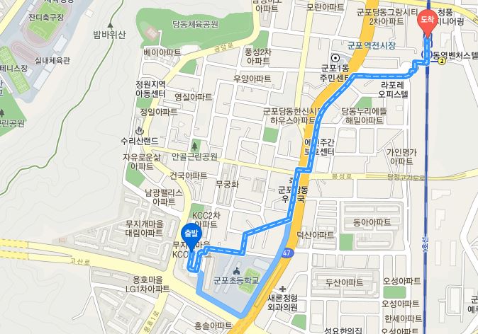 바로 앞에 군포초등학교가 있기는 한데, 가장 가까운 지하철역인 군포역은 걸어서 25분 정도 걸리는 거리니 만만치 않은 거리인 것 같습니다. 거리로는 1.4km정도 됩니다. 게다가 아파트까지 오는데 경사가 상당이 가파른 편이라서 이사를 염두에 두고 계시다면 이 부분은 잘 생각해 보셔야 할 것 같아요.