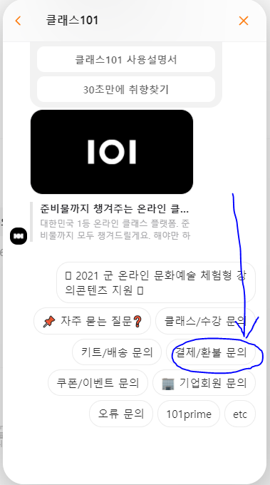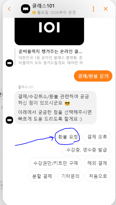 그러면 결제/환불 문의라는 창이 나옵니다. 클릭합니다.