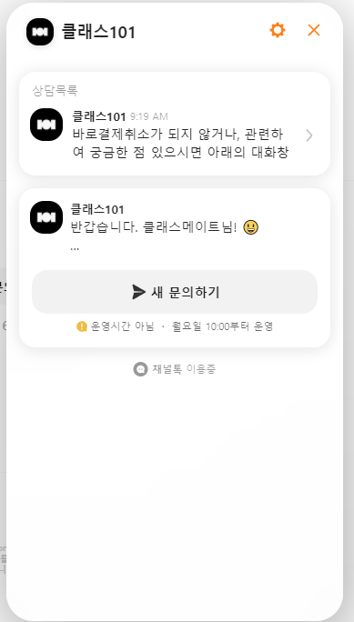 그럼 이렇게 상담창이 뜨는데요. 여기서 새 문의하기를 클릭합니다.