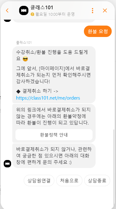 그럴땐 환불을 하면 되는데요. 클래스101의 환불정책은 아래와 같으니 한번 확인해 보시고 강의를 보시다가 이건 아니다 싶은 생각이 들 때 환불을 진행하시면 됩니다.