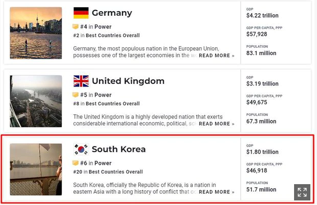 한국이 세계 국가별 국력 평가 순위에서 무려 6위라고 한다.
