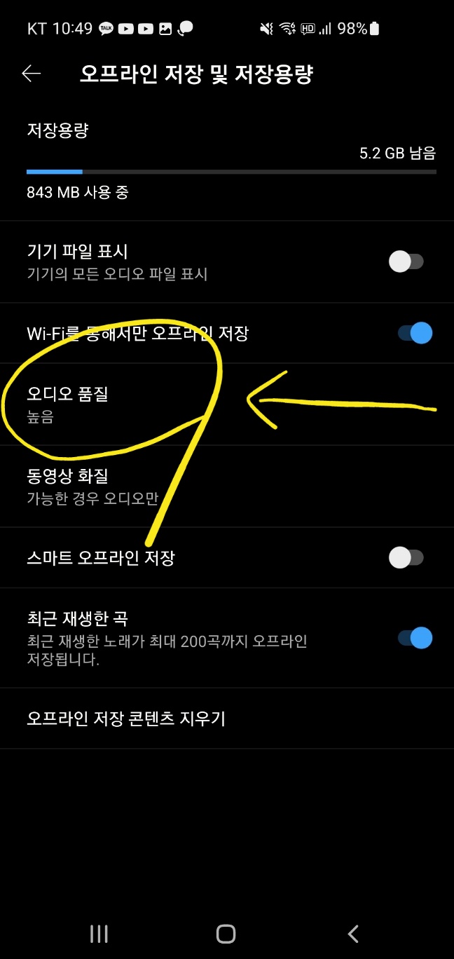 5. [그리고 오프라인 저장 및 저장 용량] 매뉴에서도 내친김에 오디오 품질을 높음으로 설정해 주자. 이 부분도 원래 기본 설정값은 보통으로 되어 있다. 음질 관련된 부분은 무조건 최고로 높음으로 설정해 주자. 우리의 귀를 위해서!