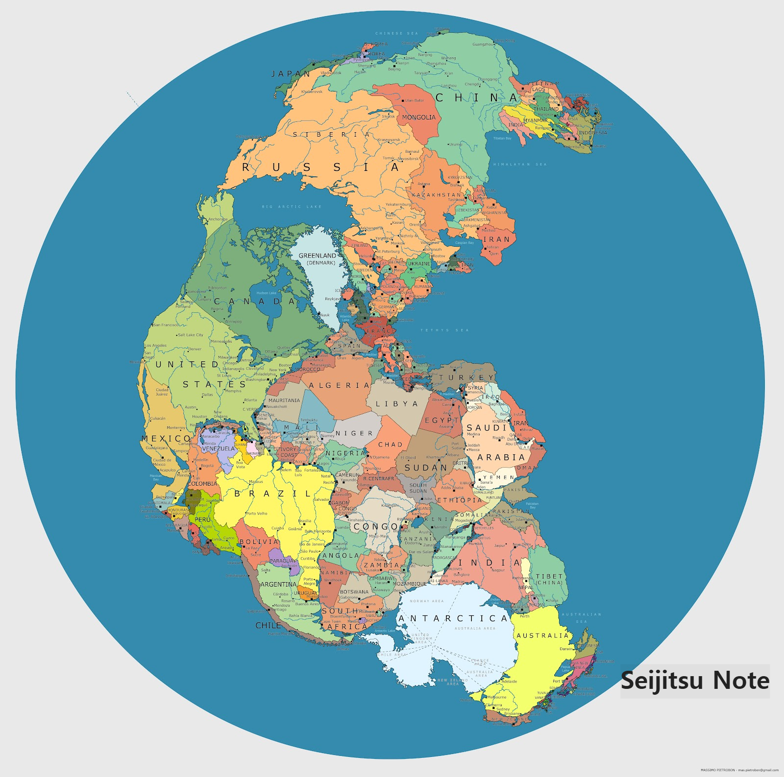 약 3억 년 전에 존재했던 초대륙 판게아를 현재 국가들을 위치하여 넣은 지도이다. 한국의 위치가 참으로 의외이다.